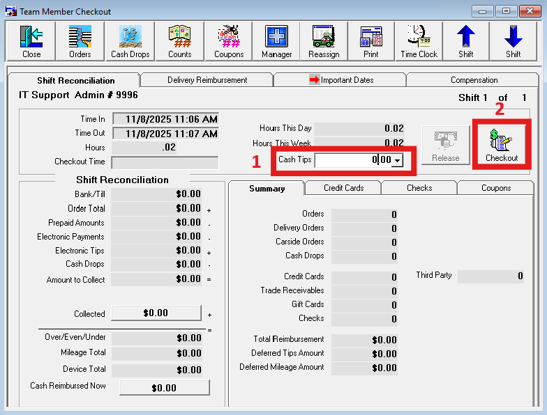 - If only not checked out → Authorized leads or managers can check them out by entering $0 in tips and pressing Checkout.