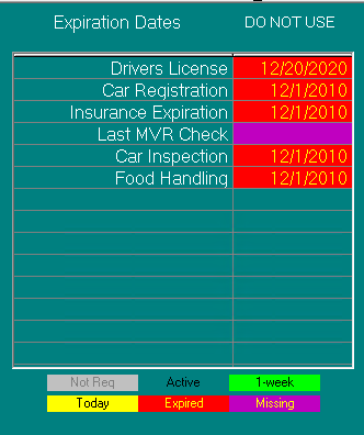 6) If any lines appear highlighted red (Expired) or purple (Missing), a Driver Compliance Form (DCF) must be completed before HR can unlock the driver.