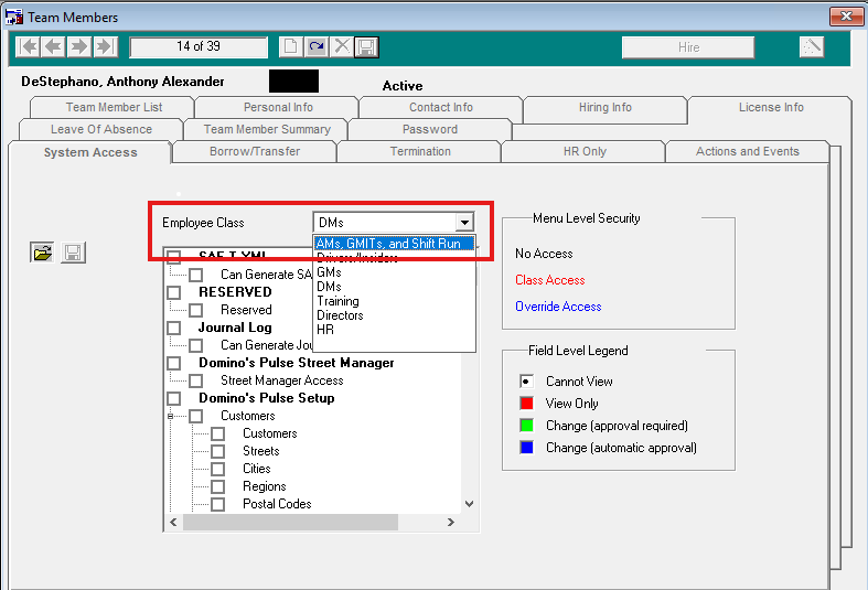 6) Use the Employee Class drop-down menu to select the correct access level for the TM.
