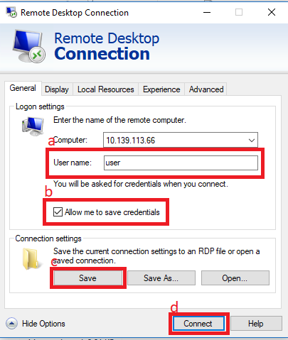 Input the username (user for old systems, localstore for new systems) (a), select Allow me to save credentials (b), click Save (c), and click Connect (d):