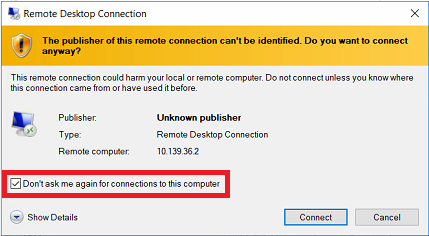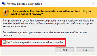 If you encounter either of the following messages, select Do not ask me again for connections to this computer before you press Connect or Yes: